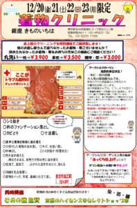 こんにちは、きものいちはです(^^) さて! ついに!! 12/20金-23土「お着物クリニック」 イベント開始まで2週間前をきりました♪ 今回いらしてくださる悉皆師さんは「ふっくら仕上げ」という特別な仕上がりを施すことができる全国各地で大人気の職人さんです(^^) 皆さま、『洗い』や『しみ抜き』などメンテナンスでなにか気になるお着物がございましたらこれが今年最後のチャンスです!!! まだご予約の […]