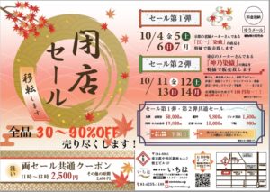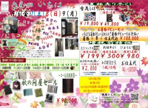 こんにちは、きものいちはです。 いっきに肌寒くなってまいりましたが皆さまいかがお過ごしでしょうか? おかげさまを持ちまして引っ越しが終了いたしました。この場をお借りして、心より御礼申し上げます。 その御礼と感謝の気持ちを込めまして・・・ 『祝!開店セール ~移転しました~』 を、開催させていただきます! ☆開店セール第1弾☆ 11/15(金)~18(月)「大松」特選特価市 京都で呉服卸商として8 […]