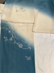 (ポリエステル) 白、紺ぼかし刺繍唐花 [身丈]:166cm [裄]:70cm [金額]:¥13,000(時間外は¥16,000)