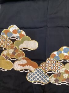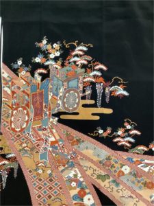 御所車に熨斗 [身丈]:157cm [前巾]:26cm [後巾]:30cm [袖丈]:49cm [裄]:63cm ※左袖後ろほつれ有り